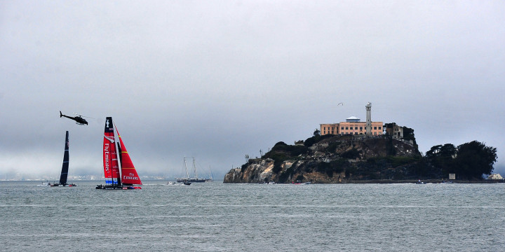 2013年9月20日,参加美洲杯帆船赛决赛的美国甲骨文队(左)和新西兰“酋长”号在比赛中经过旧金山恶魔岛。新华社发(刘艺霖摄)